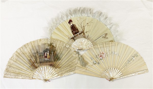 Arte della fine del secolo XIX. Lotto di tre ventagli a "grand plein" con stecche in madreperla e pagine in seta, pizzo e piume. Dipinti a rami fioriti, con scena galante in giardino firmato Bezzini, e uno con ritratti femminili monogrammati su doppia pagina firmato e datato Sappho 1885. Due in custodie (difetti)