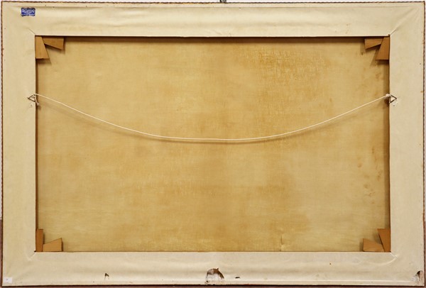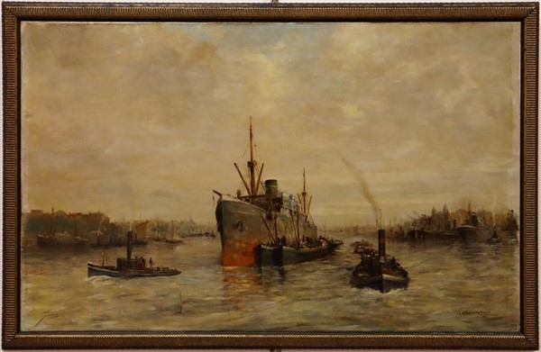 Cornelis Hendrikus Kersenboom "Navi al porto" olio su tela (cm 80x125) Firmato