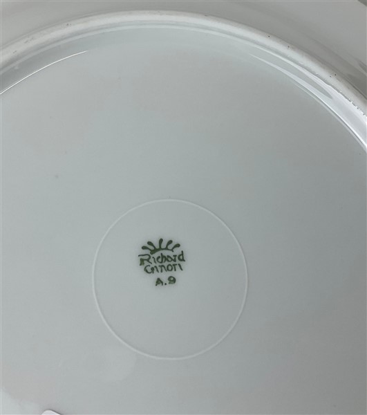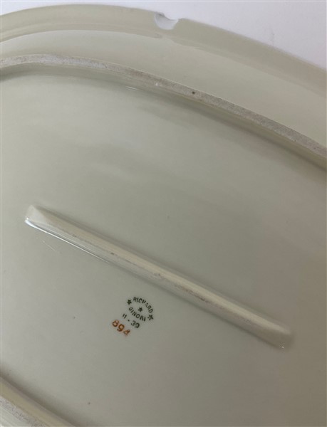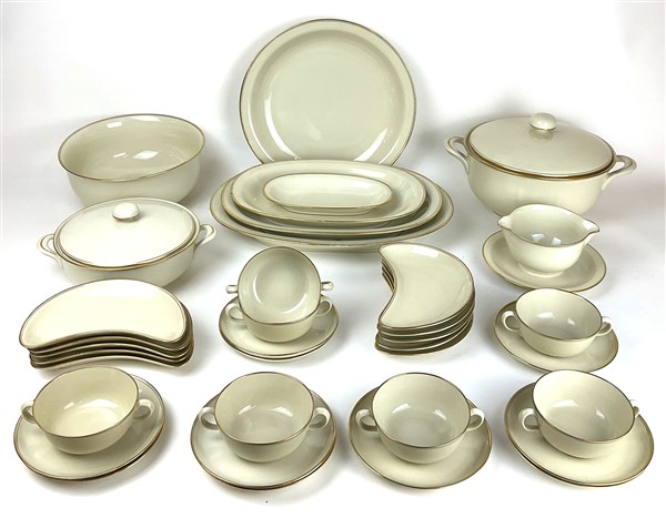 Manifattura Richard Ginori. Parte di servizio da tavola in porcellana con bordo dorato composto da: cinque vassoi da portata, due zuppiere biansate con coperchio, dieci antipastiere, insalatiera, salsiera, sette tazze biansate con dieci piattini. Unito a un'altra parte di servizio composto da otto tazze biansate, cinque piatti fondi, sette piatti piani e un'insalatiera di simil decoro (difetti)