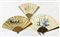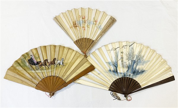 Lotto di tre ventagli con stecche in legno inciso e pagine in seta. Dipinti in