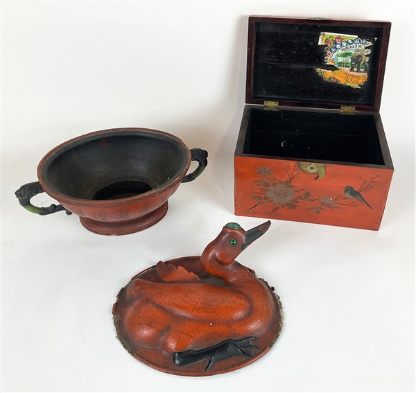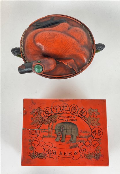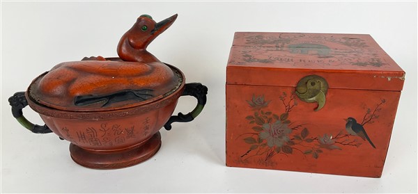 Lotto composto da una contenitore in lacca rossa con coperchio in foggia di anatra con occhi in pasta vitrea e decoro in pietra dura unita a una scatola laccata rossa con coperchio incernierato decorato da elefante dipinto entro riquadro tra ideogrammi cinesi