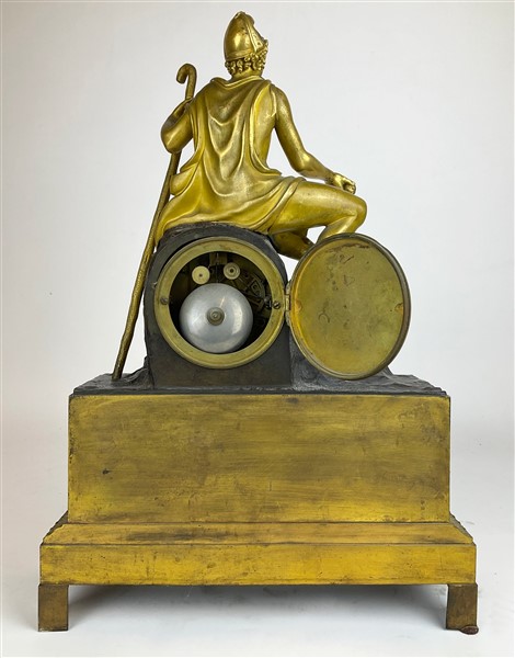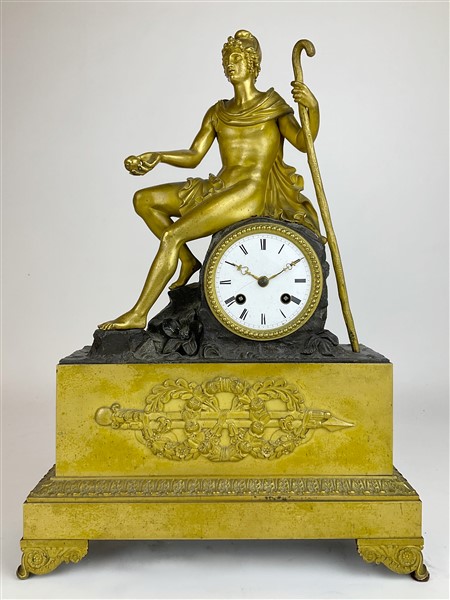 Pendola in bronzo dorato e brunito con base a plinto sormontata da figura mitologica. Quadrante in smalto bianco a numeri romani, movimento a due treni con suoneria delle ore e mezze su campanello. Francia, 1840 circa (h. cm 44) (difetti)