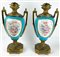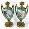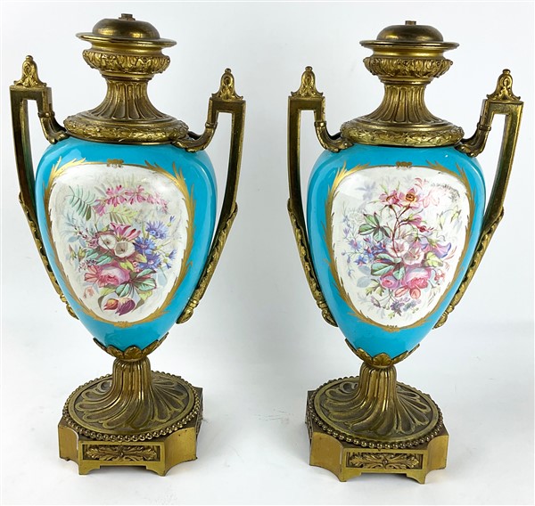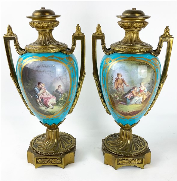 Manifattura del secolo XIX. Coppia di vasi ovoidali in stile Sevres in porcellana a fondo azzurro decorati in policromia entro riserve con cornici dorate a fiori e scene galanti, montature ed anse in bronzo dorato. Adattati a lampada in epoca successiva (h. cm 43) (difetti)