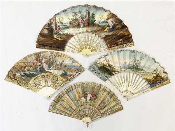 Arte del secolo XIX. Lotto di quattro ventagli con stecche in osso inciso, traforato e dipinto in policromia con decori floreali e stilizzati, pagine in carta. Dipinti a scene galanti e scene di vita bucolica (difetti e restauri)