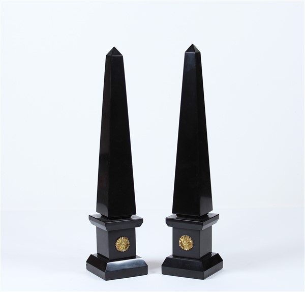 Coppia di obelischi in marmo nero. Secolo XX (h. cm 41) (difetti)