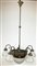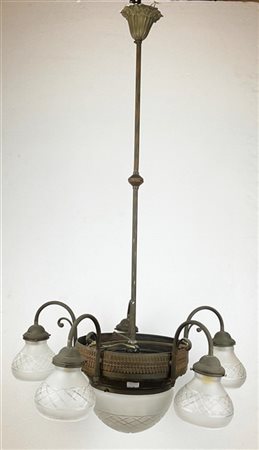 Lampadario in metallo a sei luci con paralumi in vetro smerigliato e acidato. Italia, metà secolo XX. (d cm 58) (difetti)