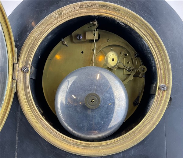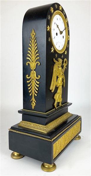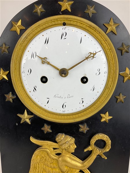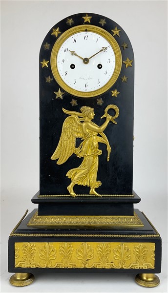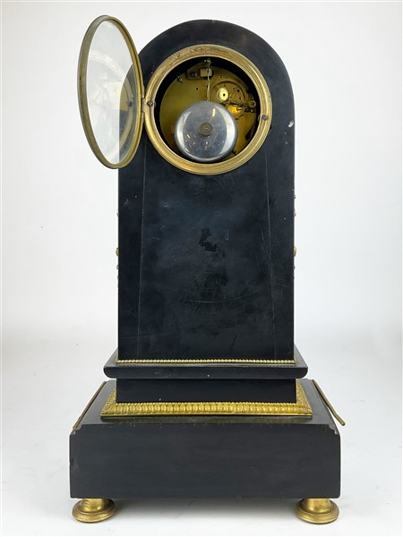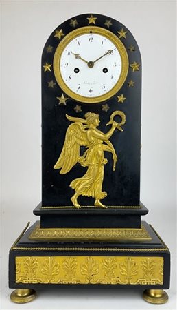 Gaulin à Paris. Pendola in marmo nero del Belgio e bronzo dorato con cassa arcuata. Quadrante in smalto bianco a cifre arabe, movimento a due treni con suoneria delle ore e mezze su campanello. Francia, 1820/1830 (h. cm 43) (difetti)