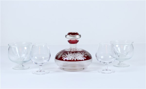 Lotto composto da una bottiglia da liquore con tappo in vetro molato in parte rosso, due bicchieri e due porta caviale in vetro (difetti)
