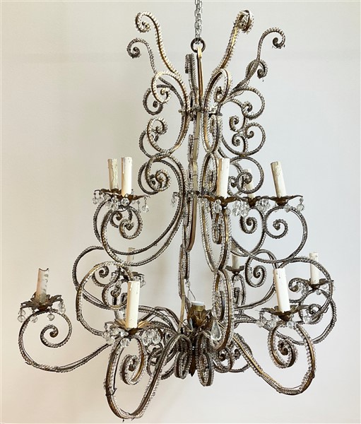 Lampadario a dodici luci in metallo dorato con bracci a volute bordati da perlinature e pendenti in vetro (h. cm 102) (difetti)