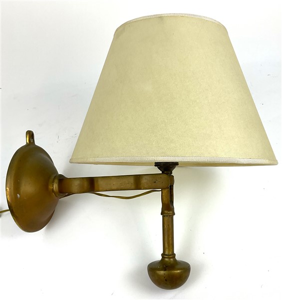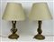 Coppia di lampade in bronzo con sostegno reggicandela basculante, fusto sagomato e base circolare (h. cm 22,5) (difetti)