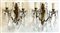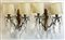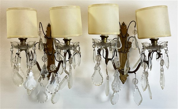 Coppia di applique a due fiamme con struttura in metallo decorato a volute e pendenti in vetro (h. cm 26) (difetti)
