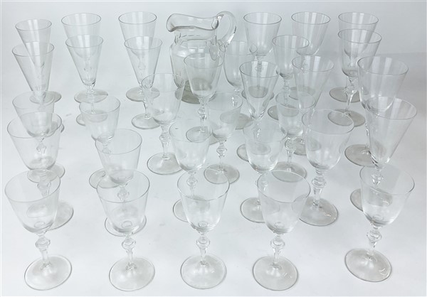 Manifattura Moser, parte di servizio di bicchieri in cristallo composto da una caraffa e quattro diverse tipologie di calice (totale 48 pz) (h max 21) (lievi difetti)
