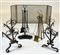 Lotto 1749 | Attrezzatura da camino composta da quattro alari, un parascintille e due divers