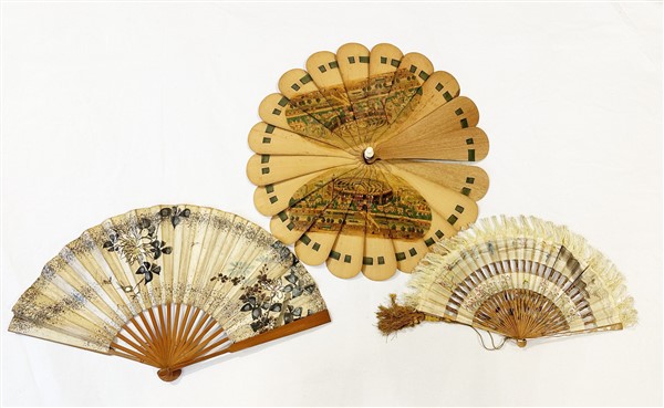 Manifatture orientali. Lotto di due ventagli con stecche in legno e pagine in carta, uniti ad un parasole mancante di manico con applicazioni in osso tornito. Dipinti a fiori e figure entro paesaggi (difetti)