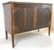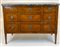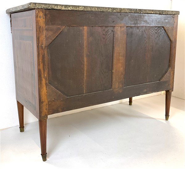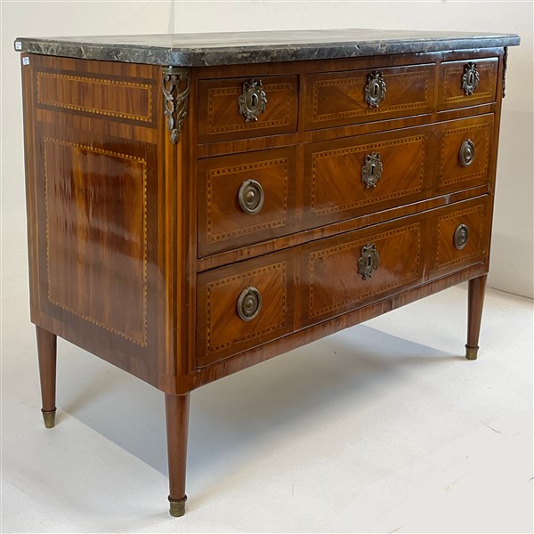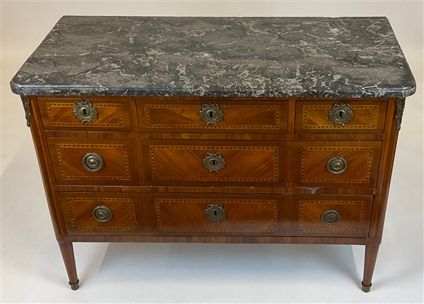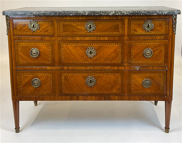Cassettone lastronato e filettato in legni vari. Fronte a due cassetti e tre tiretti sottopiano, applicazioni in metallo. Gambe rastremate e piano in marmo grigio. Francia, secolo XIX (cm 111,5x84x52) (difetti e mancanze)