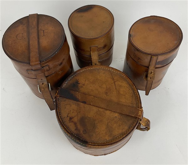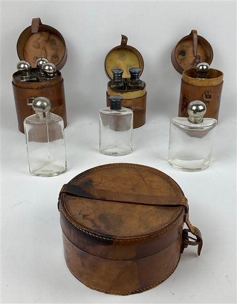 Nove porta profumi in vetro con tappi in metallo entro tre custodie di forma cilindrica in cuoio, due delle quali con monogramma impresso. Uniti a una scatola di simil fattura (h. max cm 16,5; d. max cm 11,5) (difetti)