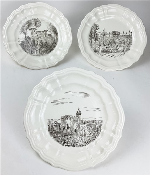 Michele Cascella per Società Ceramica Italiana Laveno, tre piatti in terraglia serigrafati con paesaggi dell'artista. Marcati sotto la base (diam cm 27)