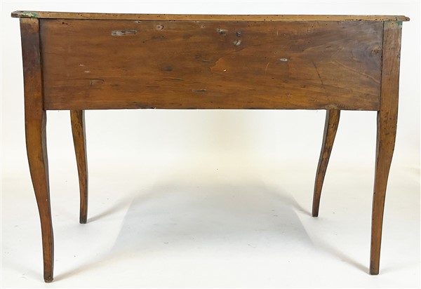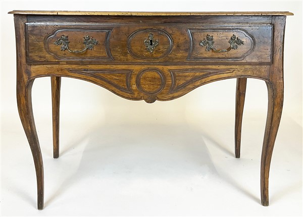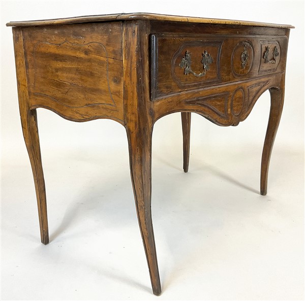 Tavolo da parete con fronte a un cassetto decorato da bordure mistilinee scanalate, grembiale sagomato e gambe mosse. Parma, secolo XVIII (cm 105x80x55) (difetti)