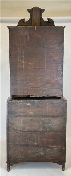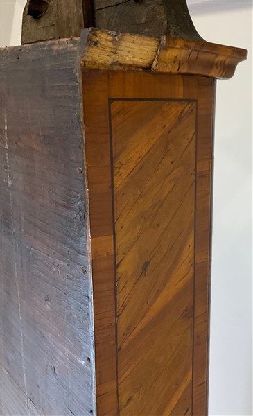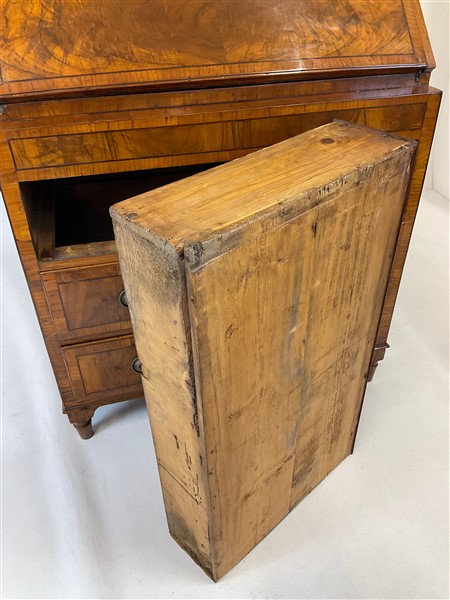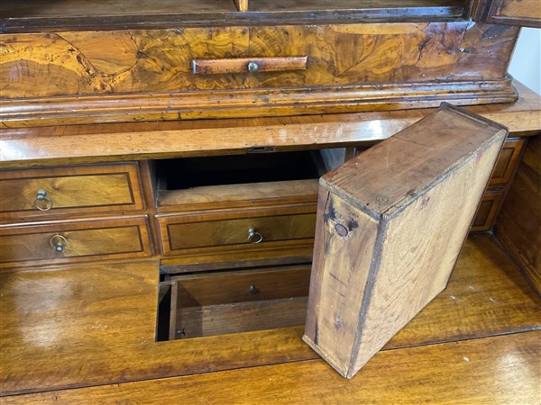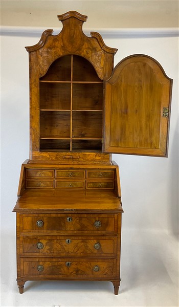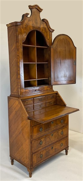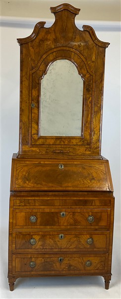 Trumeau lastronato in noce, radica di noce e filettato. Parte inferiore a tre cassetti, la calatoia rivela scarabattolo con sei tiretti e vano. Parte superiore a un'anta con specchio, cimasa a timpano spezzato (cm 68x242x49,5) (difetti, mancanze e restauri)