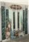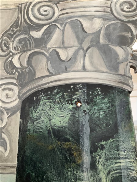 Grande pannello fondosala in tamburato dipinto in policromia con colonnato e ti