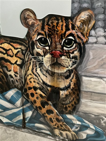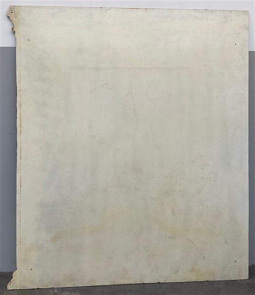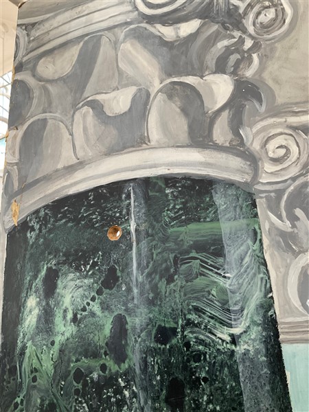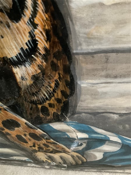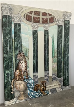 Grande pannello fondosala in tamburato dipinto in policromia con colonnato e tigrotti. Decorato al centro da specchio (cm 240x210) (difetti e mancanze)