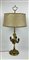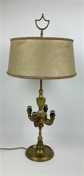 Lampada bouillotte a quattro fiamme in ottone con presa ad anello, fusto a rocchetto, base circolare. Paralume in tessuto (restauri)