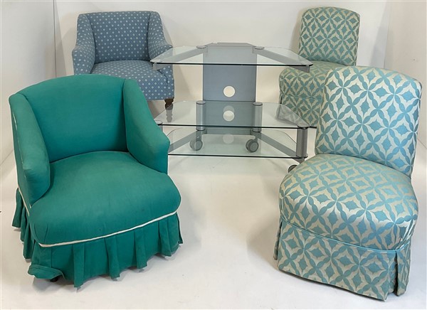 Gruppo di quattro diverse poltroncine rivestite in tessuto unite a un tavolino porta tv angolare in metallo e vetro (difetti)