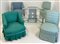 Gruppo di quattro diverse poltroncine rivestite in tessuto unite a un tavolino