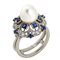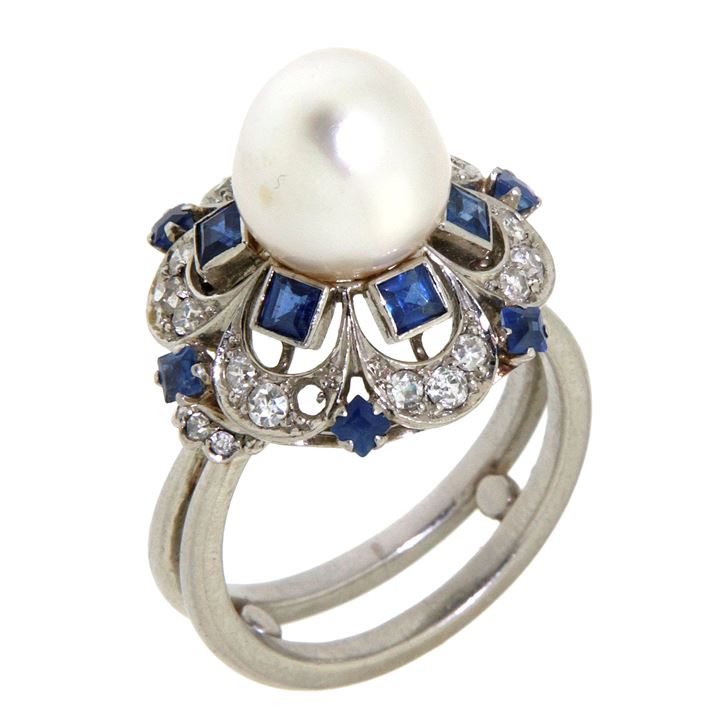Anello in oro bianco, sommità a cupola, con al centro perla, sostenuta da zaffiri taglio carrè (uno mancante) e festoni in diamanti taglio brillante e 8/8 per complessivi ct 0,40 ca
