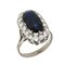 Anello in palladio con zaffiro centrale di forma ovale di ct. 4,00 ca piccola frattura interna, contornato da sedici brillanti per complessivi ct. 1 ca