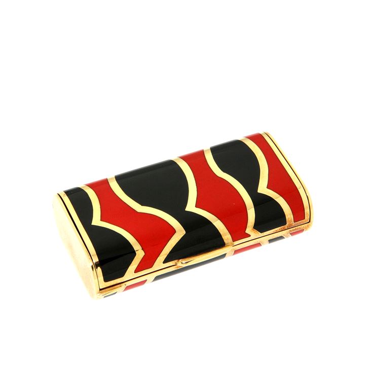 Scatola in oro giallo e smalti neri e rossi, di forma rettangolare, firmata "Fasano"