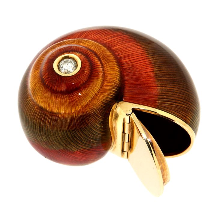 Scatola in oro giallo e smalti policromi, a forma di chiocciola, firmata "Fasano"; un diamante taglio brillante di ct 0,25 ca