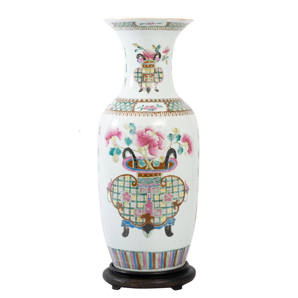 VASO in ceramica decorata e dipinta a motivo orientale, base in legno.