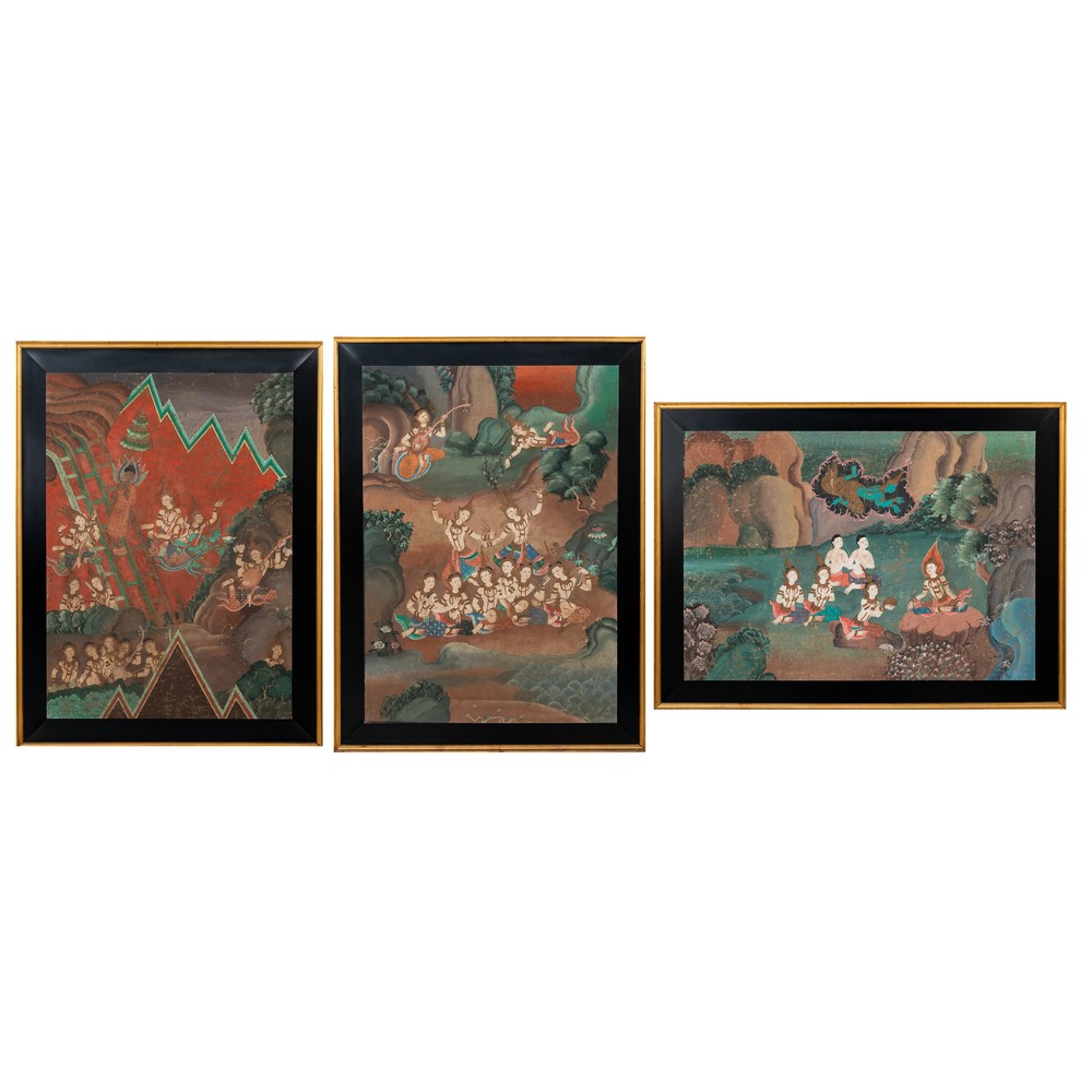 MANIFATTURA ORIENTALE DEL XIX SECOLO, Tre pannelli su tela