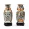 Coppia vasi in porcellana decorata a motivo floreale e fogliaceo raffiguranti "Scene di vita orientali" con basi in legno.