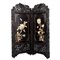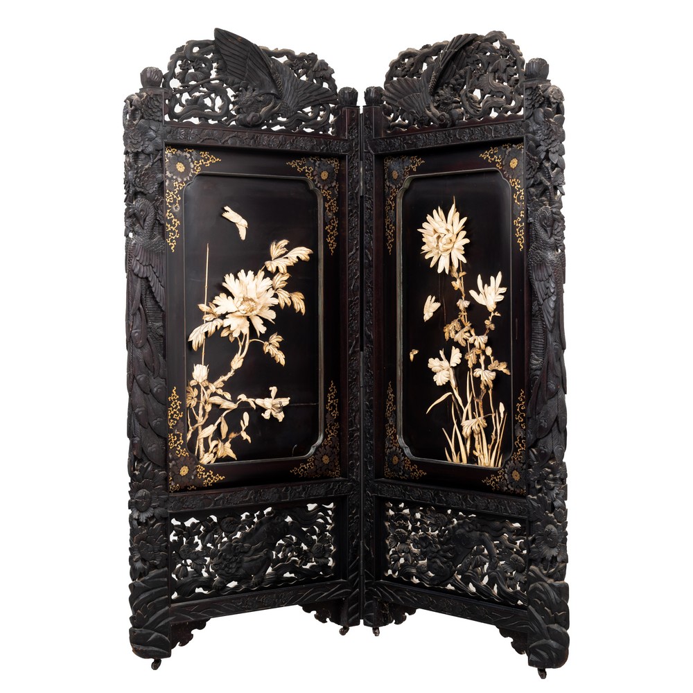 Paravento a due ante in legno ebanizzato riccamente intagliato, con elementi decorativi in osso a motivo floreale e intarsi in madreperla e ottone (usure e mancanze).