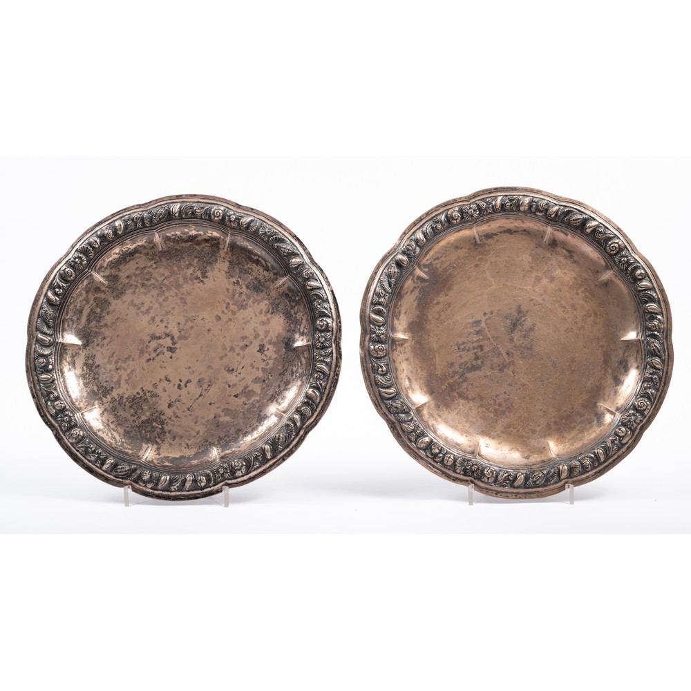 Coppia di piatti in argento con fregio centinato e sbalzato a motivo floreale e conchiglie (g. 2236).