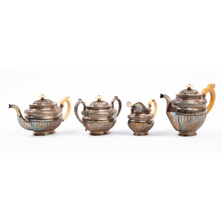Servizio in argento 875 sbalzato a motivo floreale e fogliaceo composto da caffettiera, theiera, lattiera e zuccheriera. Reca iniziali argentiere A.K (g. 2084 peso lordo) (usure e rotture).