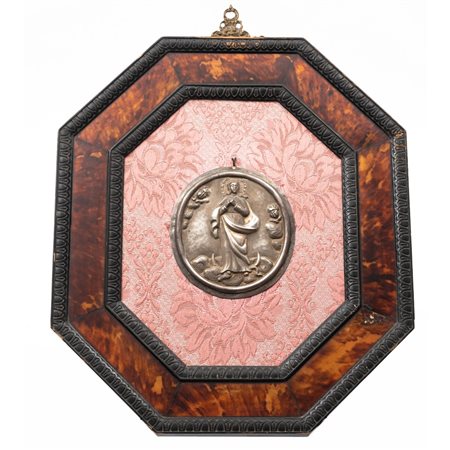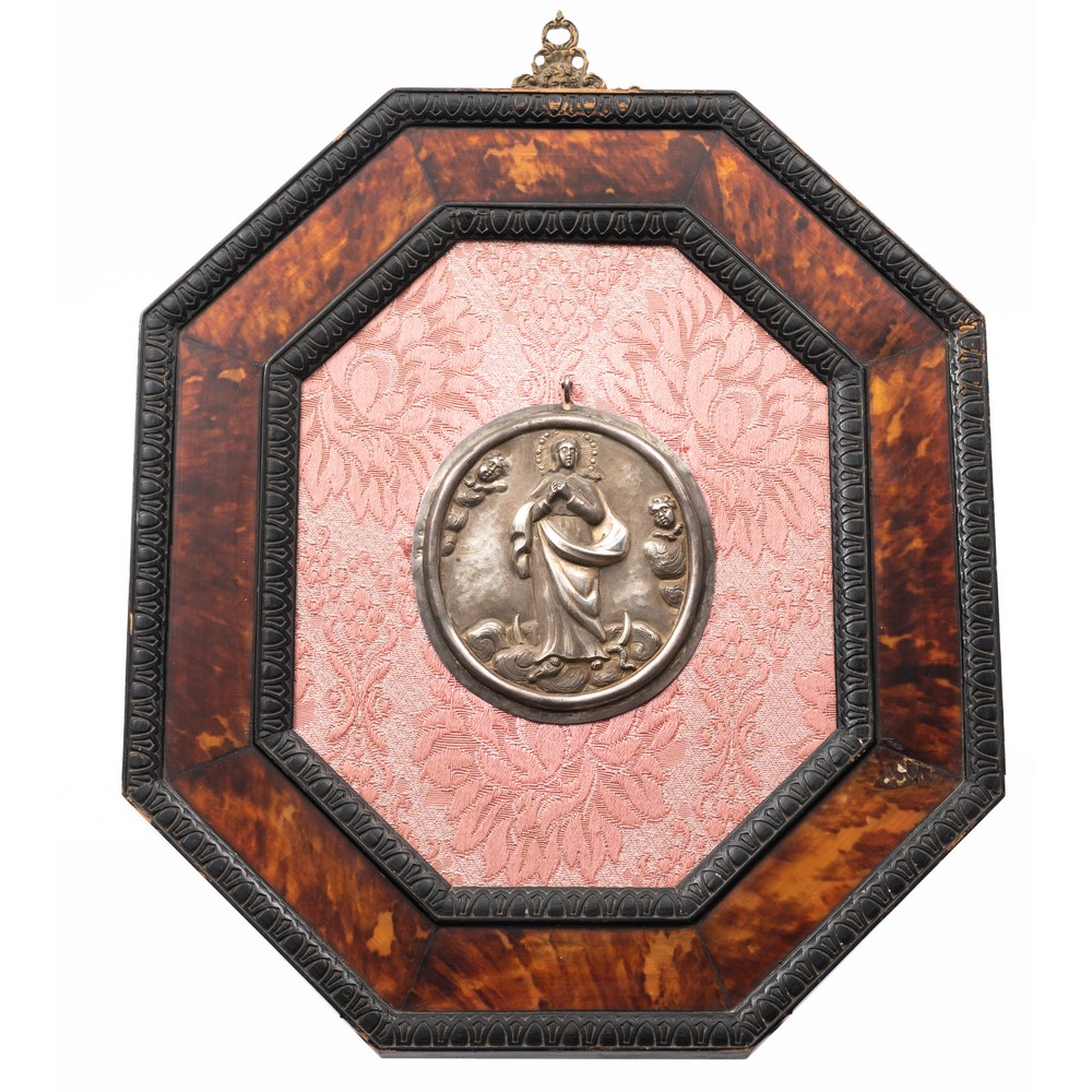 Bassorilievo in argento lavorato raffigurante “Maria Immacolata Concezione” reca punzone FP riconducibile all'argentiere Francesco Perretti, entro cornice.