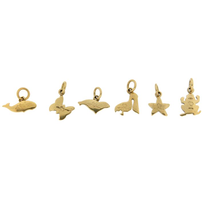 Lotto composto da sei ciondoli firmati "Pomellato", modello "Dodo", raffiguranti: una stella, una ranocchia, una foca, una farfalla, una balena e un pellicano