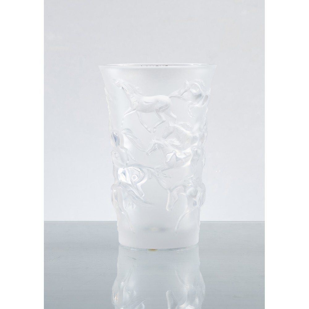 Vaso Mustang in cristallo lavorato con cavalli al galoppo a rilievo. Firma alla base. Presenta certificato e scatola originale (piccoli graffi).