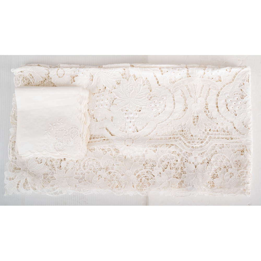 TOVAGLIA in lino nei toni del bianco con undici tovaglioli realizzata con intaglio e ricami a mano.