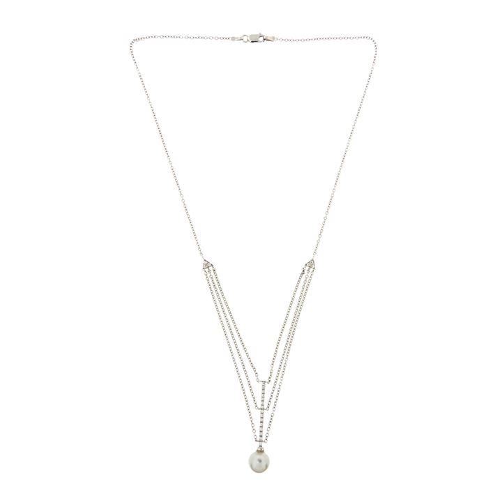 Girocollo in oro bianco, al centro tre fili raccordati da barretta in diamanti taglio brillante per complessivi ct 0,25 ca terminante con perla australiana dal diam di mm 9,0