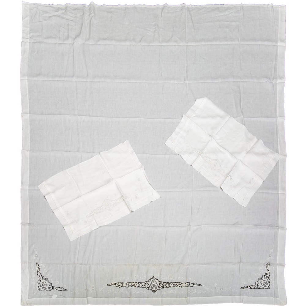 LENZUOLO matrimoniale, con due federe in lino, nei toni del bianco; ricamo a mano (macchie).
