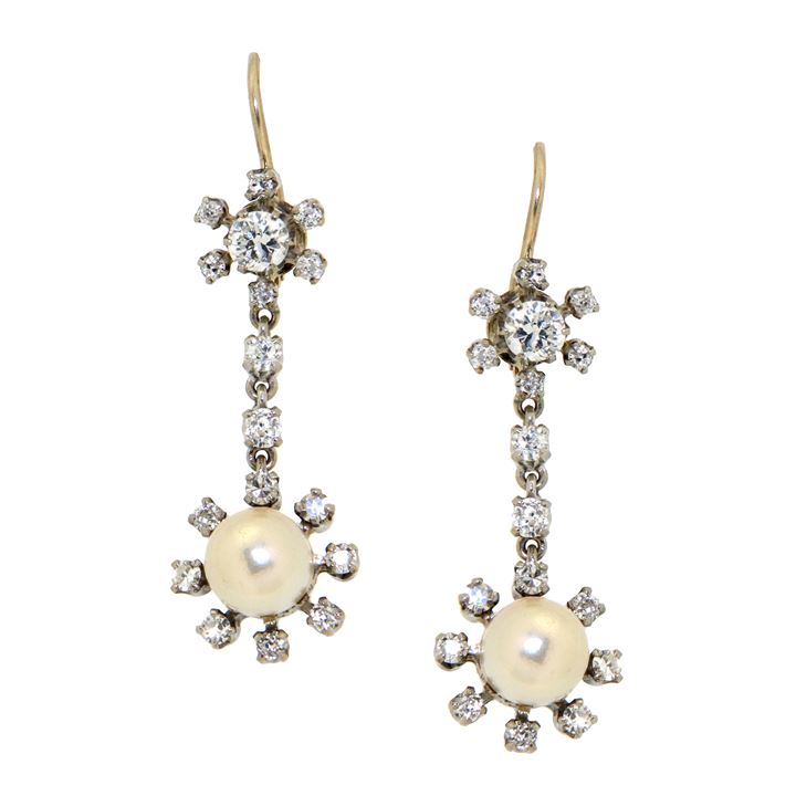 Coppia di orecchini pendenti in oro giallo e bianco, a forma di fiore, con due diamanti taglio brillante di ct 0,50 ca, diamanti taglio brillante di vecchio taglio e 8/8 per complessivi ct 0,60 ca e due perline