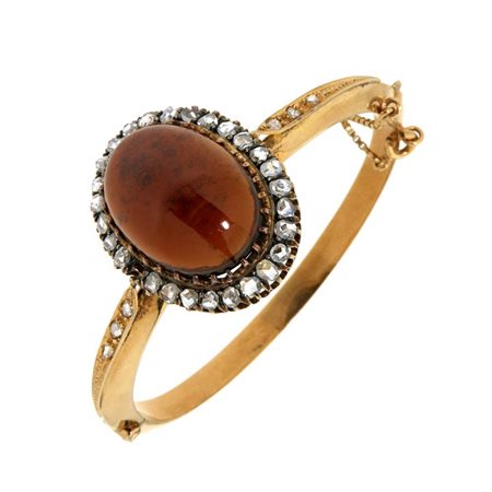 Bracciale rigido in oro giallo, epoca fine XIX secolo, recante al centro un granato cabochon contornato da diamanti (uno mancante)