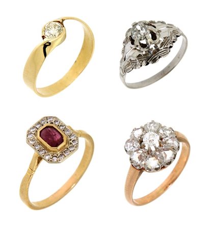 e diamanti taglio brillante per complessivi ct 0,25 ca; il secondo in oro bianco con diamante solitario taglio brillante di vecchio taglio di ct 0,35 ca (scheggiato); il terzo in oro giallo con diamante centrale taglio brillante di vecchio taglio di ct 0,15 ca contornato da rose fiamminghe; il quarto in oro giallo con diamante solitario taglio brillante di ct 0,25 ca