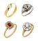 Lotto composto da quattro anelli: il primo in oro giallo, sommità rettangolare con rubino taglio ovale