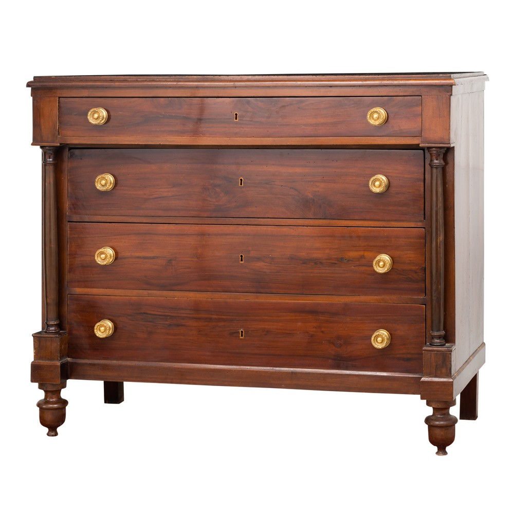 Cassettone Impero in legno di noce con quattro cassetti e pomoli in bronzo dorato.