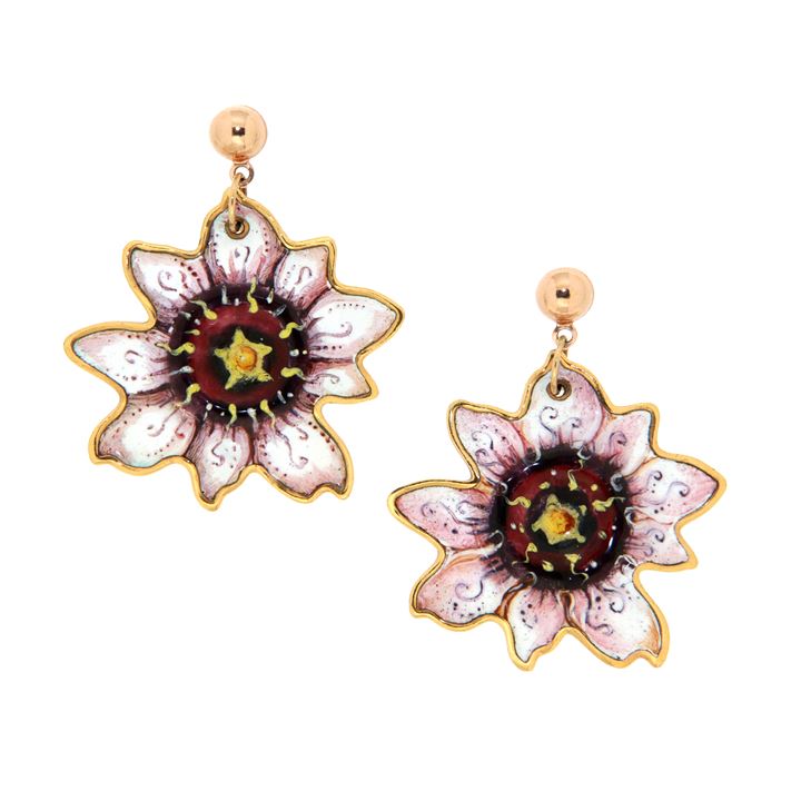 Coppia di orecchini in oro rosa, firmati "Rivalta", collezione "Floris", raffiguranti il fiore della passione in smalti policromi